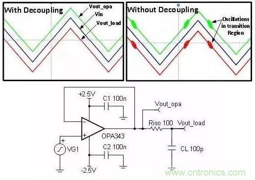 要回答這個問題,需要考證在不使用去耦器件時會出現什么問題。 圖 1 為帶去耦電容器和不帶去耦電容器(C1 和C2)情況下用于驅動 R-C 負載的緩沖電路。我們注意到,在不使用去耦電容器的情況下,電路的輸出信號包含高頻 (3.8MHz) 振蕩。對于沒有去耦電容器的放大器而言,通常會出現穩(wěn)定性低、瞬態(tài)響應差、啟動出現故障以及其它多種異常問題。