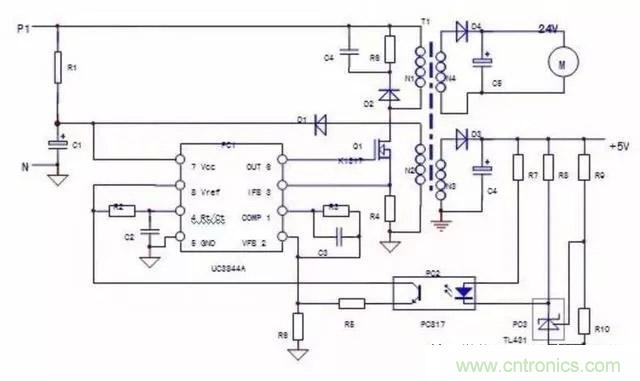 B.對UC3844單獨上電,短接PC2輸入側(cè),若電路起振,說明故障在PC2輸入側(cè)外圍電路;電路不起振則檢查輸出側(cè)電路。