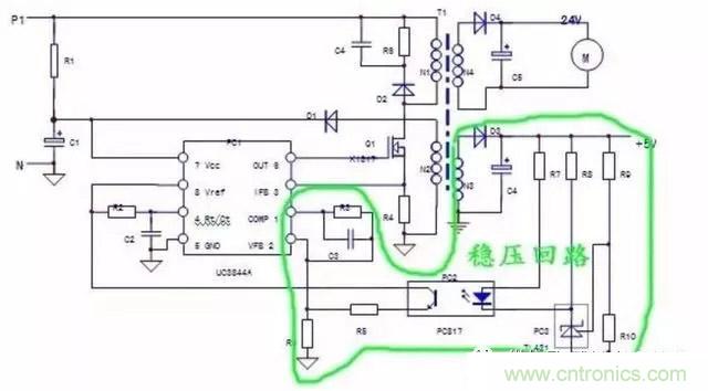 當然,PC1芯片和1,2腳外圍元件R3,C3也是穩(wěn)壓回路的一部分。