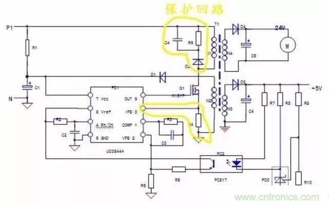 3)保護回路:PC1芯片本身和3腳外圍元件R4構(gòu)成過電流保護回路;N1繞組上并聯(lián)的D2,R6,C4元件構(gòu)成了開關(guān)管的反壓吸收保護電路;實質(zhì)上穩(wěn)壓回路的電壓反饋信號——穩(wěn)壓信號,也可看作一路電壓保護信號,但保護電路的內(nèi)容并不僅是局限于保護電路本身,保護電路的啟控往往是由于負載電路異常所引起的。