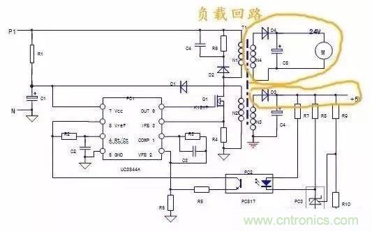 4)負載回路:N3,N4二次繞組及后續(xù)電路,均為負載回路,負載回路的異常,會牽涉到保護回路和穩(wěn)壓回路,使兩個回路做出相應(yīng)的保護和調(diào)整動作。