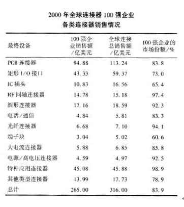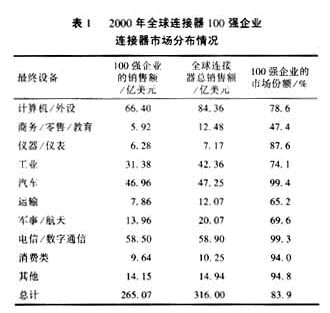 自2001年以來(lái),受“9.11”恐怖事件、網(wǎng)絡(luò)通訊業(yè)泡沫破滅及美國(guó)經(jīng)濟(jì)低迷的影響,世界連接器市場(chǎng)一度遭受重創(chuàng),2001年的銷(xiāo)售額下降19.1%,但是,軍用連接器市場(chǎng)卻在平穩(wěn)中微增。據(jù)Fleck的研究報(bào)告,軍事/航天用連接器2000年的銷(xiāo)售額為20.072億美元,2001年達(dá)到20.118億美元,增長(zhǎng)0.2%。全球連接器100強(qiáng)企業(yè)占據(jù)了69.1%軍用連接器市場(chǎng)份額,如表1所示。各類(lèi)軍用連接器也基本上由全球100強(qiáng)企業(yè)所壟斷,如表2所示。