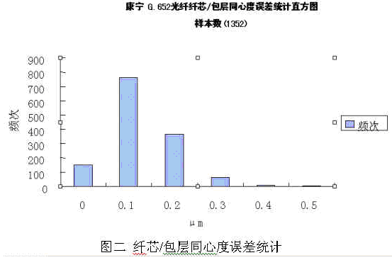 對于原材料之一的緊套光纜及光纖,成都康寧光纜全部采用美國康寧產(chǎn)光纖,依托康寧公司全球領(lǐng)先的光纜制造技術(shù),制造出國內(nèi)領(lǐng)先水平的緊套光纜,并用之于本公司的連接器跳線的生產(chǎn),確保光纖光纜原材料的品質(zhì)。圖二和圖三即是本公司采用的康寧公司G652光纖的主要特性參數(shù),其纖芯/包層同心度誤差和衰減系數(shù)統(tǒng)計值均遠好于國內(nèi)相關(guān)行業(yè)標(biāo)準(zhǔn)的要求(行業(yè)標(biāo)準(zhǔn)的要求分別為≤0.5μm和≤0.5dB/km):