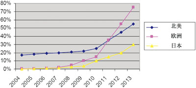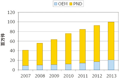 汽車導(dǎo)航市場(chǎng)中,根據(jù)ST公司的估計(jì),2008年P(guān)ND的出貨量同比將增長(zhǎng)43%,從2007年的3200萬(wàn)件增長(zhǎng)到4600萬(wàn)件。主要增長(zhǎng)動(dòng)力依然來(lái)自車載導(dǎo)航市場(chǎng)的低于水準(zhǔn)的普及率,對(duì)市場(chǎng)的教育和推廣的力度依然不夠。低成本的OEM導(dǎo)航儀(兩用便攜導(dǎo)航儀)將會(huì)在中級(jí)汽車中開(kāi)辟新的市場(chǎng),預(yù)計(jì)到2012年在歐美新售的汽車中,車載導(dǎo)航儀占有率將超過(guò)25%。2007-2013年OEM儀表板內(nèi)置導(dǎo)航儀的年均增長(zhǎng)率將達(dá)到15%,便攜式導(dǎo)航儀的增長(zhǎng)速度為16%,預(yù)計(jì)到2013年導(dǎo)航市場(chǎng)規(guī)模將達(dá)到汽車影響的水平。