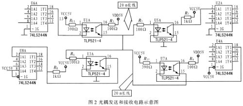采用光電隔離器TLP521-4對(duì)發(fā)送和接收設(shè)備進(jìn)行電氣隔離,對(duì)于減小交流阻抗的作用十分明顯,進(jìn)而增大傳輸電流,有效地抑制地線噪聲;同時(shí)由于74LS244N的應(yīng)用??偩€驅(qū)動(dòng)能力得到保障。圖2為光耦發(fā)送和接收電路示意圖。圖2中,上半部?jī)晒怦钭宰笙蛴覀鬏斝盘?hào),下半部?jī)晒怦钭杂蚁蜃髠鬏斝盘?hào),左端74LS244N通過靜態(tài)存儲(chǔ)器IDT7132與處理器進(jìn)行數(shù)據(jù)交換,右端通過8255與處理器進(jìn)行數(shù)據(jù)交換。