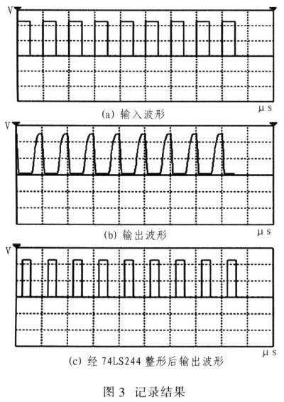 調(diào)試中,輸入周期為100μs,占空比為1/2的+5V方波,對(duì)一路光耦的輸入端波形和經(jīng)過20m長(zhǎng)線后接收光耦的輸出端波形以及經(jīng)過74LS244整形后的波形進(jìn)行記錄。記錄結(jié)果如圖3所示。