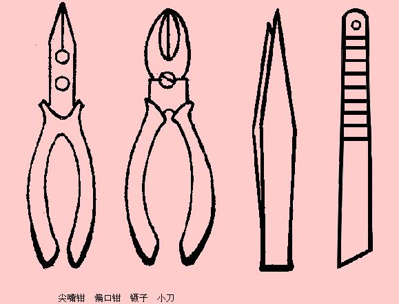 為了方便焊接操作常采用尖嘴鉗、偏口鉗、鑷子和小刀等做為輔助工具。同學們應(yīng)學會正確使用這些工具。