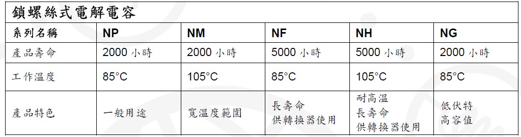 全新推出的工業(yè)級超長效鎖螺絲式電解電容系列包括NP、NM、NF、NH、NG 等五個系列,分別鎖定一般用途、寬溫度范圍、長效轉換器、高溫環(huán)境轉換器以及低電壓大容值等應用。工作溫度范圍涵蓋85°C 至105°C;使用壽命時效,則一舉提升至2000 到5000 小時。與其他同類型產(chǎn)品相比,具備難以匹敵的寬溫度范圍及長時效特性。