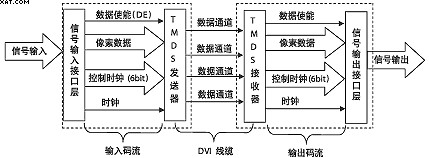 DVI是基于TMDS(TransitionMinimizedDifferentialSignaling,轉(zhuǎn)換最小差分信號(hào))技術(shù)來(lái)傳輸數(shù)字信號(hào),TMDS運(yùn)用先進(jìn)的編碼算法把8bit數(shù)據(jù)(R、G、B中的每路基色信號(hào))通過(guò)最小轉(zhuǎn)換編碼為10bit數(shù)據(jù)(包含行場(chǎng)同步信息、時(shí)鐘信息、數(shù)據(jù)DE、糾錯(cuò)等),經(jīng)過(guò)DC平衡后,采用差分信號(hào)傳輸數(shù)據(jù),它和LVDS、TTL相比有較好的電磁兼容性能,可以用低成本的專(zhuān)用電纜實(shí)現(xiàn)長(zhǎng)距離、高質(zhì)量的數(shù)字信號(hào)傳輸。TMDS技術(shù)的連接傳輸結(jié)構(gòu)如圖1所示。