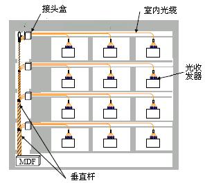 總配線架(MDF)安裝在大樓內的公共地區(qū),光纜通過垂直的桿狀物通向各樓層,再通過水平方向上的管道進入房間。