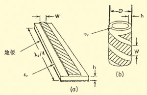 把一體化電視機視為一種計算機以后,只要把全方位螺旋微帶貼片天線直接插入數(shù)字電視機就能收看電視節(jié)目,在移動中接收數(shù)字電視,因為信號隨地理位置而變化,信道特性作動態(tài)變化,這就要求天線對不同信道的動態(tài)特性變化的穩(wěn)定可靠性做出實時反映,在移動中天線需在全方位范圍內(nèi)保持一定的帶寬和增益。為此我們設計出一種全方位圓柱體螺旋微帶貼片天線,它把1/4波長的微帶諧振器呈螺旋狀地繞在具有一定厚度(h)的空心圓柱體上,其微帶貼片與地板構成同軸圓柱體,體積比較小,可以和任何載體共形(例如汽車),同時也能設計成任何規(guī)格(例如:50Ω,75Ω)的帶線與同軸聯(lián)結器聯(lián)結,不需要匹配網(wǎng)絡,且空芯內(nèi)部可以安裝有源電子器件。圖1就是1/4波長全方位微帶螺旋貼片天線的示意圖,(a)是1/4波長微帶諧振器,(b)是1/4波長全方位微帶螺旋貼片天線的示意圖。