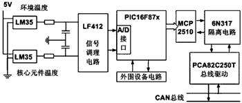 本節(jié)點(diǎn)的核心MCU是PIC16F87x,是Microchip公司推出的低功耗8位單片機(jī)。PIC16F87x擁有精簡(jiǎn)指令集,執(zhí)行速度為200ns。CAN控制器采用Microchip公司的MCP2510,總線驅(qū)動(dòng)器采用PCA82C250,總線隔離電路采用光耦6N317,信號(hào)調(diào)理電路采用LF412。溫度監(jiān)測(cè)模塊的硬件結(jié)構(gòu)如圖2所示。