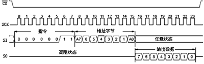 在讀操作開始時(shí),CS引腳將被置為低電平。隨后讀指令和8位地址碼(A7~A0)將被依次送入MCP2510。在接收到讀指令和地址碼之后,MCP2510指定地址寄存器中的數(shù)據(jù)將被移出通過SO引腳進(jìn)行發(fā)送。每一數(shù)據(jù)字節(jié)移出后,器件內(nèi)部的地址指針將自動(dòng)加一以指向下一地址。因此可以對(duì)下一個(gè)連續(xù)地址寄存器進(jìn)行讀操作。通過該方法可以順序讀取任意一個(gè)連續(xù)地址寄存器中的數(shù)據(jù)。通過拉高CS引腳電平可以結(jié)束讀操作,如圖6所示。