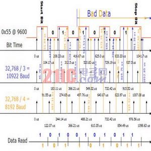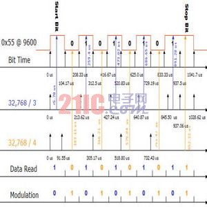 UART數(shù)據(jù)用10,922波特或8,192波特的UART接收。由于UART在傳輸中間點對數(shù)據(jù)進行采樣以補償抖動,因此該點已經(jīng)被選擇為接收UART的采樣點。在沒有行抖動的理想情況下,10,922波特UART對第三數(shù)據(jù)位的開始兩次讀數(shù)都會是錯誤的而8,192波特的UART由于會完全遺漏第三位,很快就將出錯。由于低功耗應(yīng)用的理想時鐘是低功耗實時時鐘模式,這使得在低功耗環(huán)境中處理很困難。解決這一問題的最好辦法就是將µC與調(diào)制技術(shù)結(jié)合使用,用32kHz振蕩器提供非常精確的2,400波特,并完全能支持9,600波特(參見圖3)。