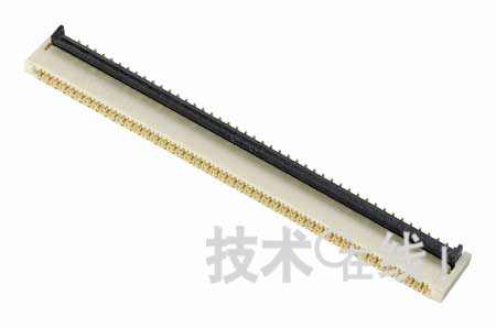 此制品以間距0.3mm、高1.1mm、進(jìn)深4.3mm(滑片鎖上時(shí))尺寸,制成了90引腳的多極連接器。合適的FPC厚度為0.2mm。因采用上下配備接點(diǎn)的構(gòu)造,設(shè)計(jì)時(shí)可無需考慮插入的FPC接點(diǎn)方向。