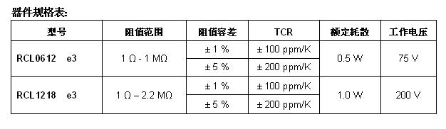 RCL e3系列的容差為1%和5%,TCR為±100ppm/K和±200ppm/K,阻值范圍為1 Ω~2.2MΩ。電阻具有一層保護(hù)釉面,在鎳阻擋層上的純錫焊接面兼容無(wú)鉛和含鉛焊接工藝。器件符合RoHS指令2002/95/EC,并符合IEC 61249-2-21的無(wú)鹵素定義。