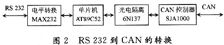 RS232串口的幀格式為:1位起始位,8位數(shù)據(jù)位,1位可編程的第9位(此位為發(fā)送和接收的地址/數(shù)據(jù)位),1位停止位。而CAN的數(shù)據(jù)幀格式為:幀信息+ID+數(shù)據(jù)(可分為標(biāo)準(zhǔn)幀和擴(kuò)展幀兩種格式)。因此,設(shè)計(jì)時(shí)就需要有一個(gè)微控制器來(lái)實(shí)現(xiàn)電平和幀格式等的轉(zhuǎn)換,其轉(zhuǎn)換方式如圖2所示。