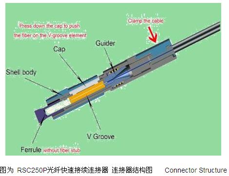 RSC250P光纖快速接續(xù)連接器采用非預(yù)置光纖技術(shù),精密金屬V型槽同軸自準可靠固緊,宇特專利的箱砌式雙卡緊裝置,防縮尾彎設(shè)計,一體化防摔抗壓結(jié)構(gòu)。成端性能優(yōu)異,完全達到FTTH光纖到戶使用要求。