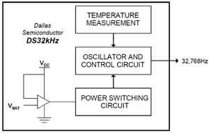 本節(jié)將以Maxim公司的DS32kHz溫補(bǔ)晶體振蕩器為例,介紹通過改變晶體負(fù)載電容修正由于溫度變化產(chǎn)生的頻偏的概念,如圖2所示,Maxim的這項(xiàng)內(nèi)部校準(zhǔn)技術(shù)還獲得了專利。DS32kHz可以作為大多數(shù)系統(tǒng)的32kHz輸入,如RTC或內(nèi)置RTC的微控制器。