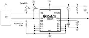 如圖5所示,典型的DS3231應(yīng)用電路內(nèi)部集成了晶體,其他電路類似于普通RTC,設(shè)計(jì)人員無須考慮分立晶體的選擇和布板。因?yàn)镈S3231包含經(jīng)過溫度補(bǔ)償校準(zhǔn)的振蕩器,可顯著提高RTC的初始精度和溫度穩(wěn)定性。由于內(nèi)嵌在封裝內(nèi)的晶體已經(jīng)經(jīng)過高溫老化處理,DS3231與分立的晶體相比具有更好的長期穩(wěn)定性。精度可以達(dá)到±2×10-6,溫度范圍0~+40℃。