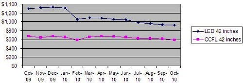 當(dāng)美國消費者為“黑色星期五(編按:指感恩節(jié)隔日的星期五,為美國零售業(yè)傳統(tǒng)的大折扣日) ”迫切尋找最劃算的采購項目之際,液晶電視(LCD TV)仍是他們希望采購物品清單上的首選。根據(jù)市場研究機(jī)構(gòu) The NPD Group 的數(shù)據(jù),采用 LED背光液晶電視的平均售價為1,106美元,從2009年10月到2010年10月一年之間,共下跌了44%;而傳統(tǒng)冷陰極管(CCFL)背光液晶電視的價格也顯著下滑,年下跌幅度24%,目前平均售價僅435美元。