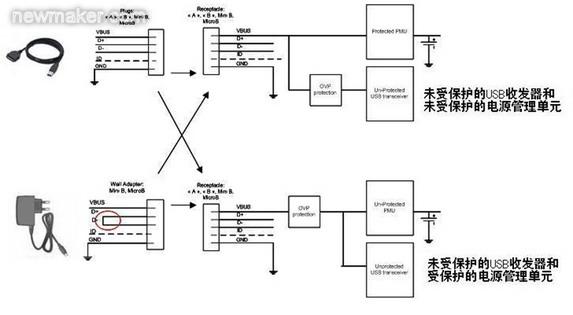 在連接個(gè)人計(jì)算機(jī)(PC)等標(biāo)準(zhǔn)USB源設(shè)備時(shí),連接器上將包含Vbus電源端子和數(shù)據(jù)端子(D+和D-)。Vbus電壓值由USB規(guī)范明確定義:額定電壓為5V,最高可達(dá)5.25V。事實(shí)上,較長(zhǎng)的線纜會(huì)因串連電感產(chǎn)生振鈴現(xiàn)象。這個(gè)最大振鈴紋波電壓取決于移動(dòng)設(shè)備的輸入電容和寄生電感。售后非原配件往往具有較低的性能,電纜也會(huì)有較高的寄生參數(shù),這些因素對(duì)連接的外設(shè)可能造成潛在危害。