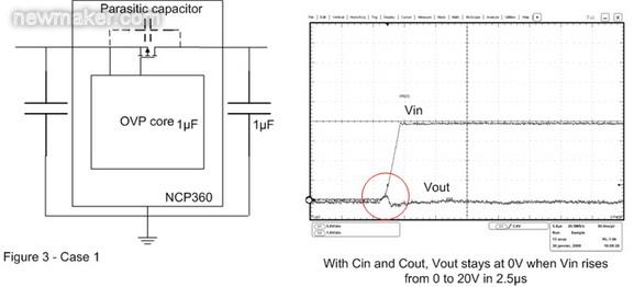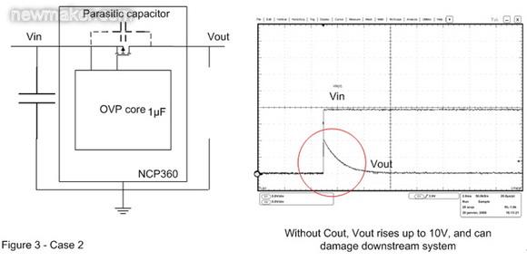 在圖3的案例2中,輸出電容已被移除。這樣,當(dāng)OVP器件輸入端出現(xiàn)快速輸入瞬態(tài)現(xiàn)象時(shí),旁路元件將保持開(kāi)路。這時(shí)可以在輸出端觀察到過(guò)沖,這個(gè)過(guò)沖可能會(huì)損壞連接至OVP輸出端的電子元器件。為了解決這個(gè)問(wèn)題,必須在輸出引腳上連接一個(gè)輸出電容,并盡量靠近OVP 器件擺放。