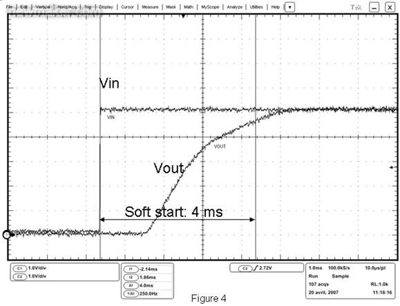 正如“電氣特性和防護(hù)措施”小節(jié)所述那樣,浪涌電流是造成器件電氣損壞的根源之一,需要采用OVP器件來(lái)克服這一問(wèn)題。為了避免任何類(lèi)型的浪涌行為,OVP器件中通常都包含了軟啟動(dòng)順序。這個(gè)特殊順序貫穿于PFet門(mén)的逐漸上升過(guò)程中,見(jiàn)圖4。