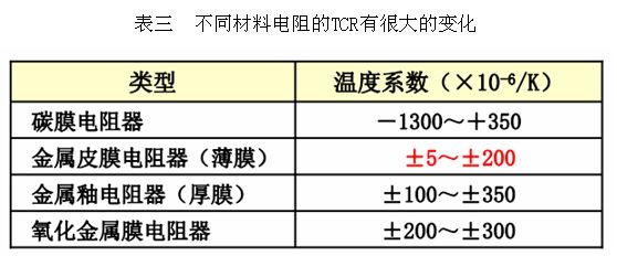 目前TCR小的電阻器只有薄膜電阻,一般情況下,碳膜與陶瓷電阻器TCR為負,對于低TCR設(shè)計,首選推薦10ppm。不同材料電阻的TCR有很大的變化,大致范圍可以從下表看出: