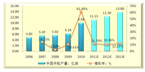 2006-2013年中國手機產(chǎn)量及未來發(fā)展趨勢