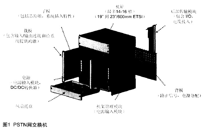 圖1所示為一個PSTN網(wǎng)的交換機,該交換機由7個部分組成。除了機箱尺寸的區(qū)別,機箱底部是一個機架的管理模塊,它包括管理模塊、傳輸背板和傳輸模塊。最前面有子板、載板、電源板,以及風冷系統(tǒng)、電扇托板。在交換機中,它的主要載板就是電話信息的傳輸以及輸入/輸出的連接,輸入,輸出系統(tǒng)所組成的只有很少的電腦板以及信令控制板。