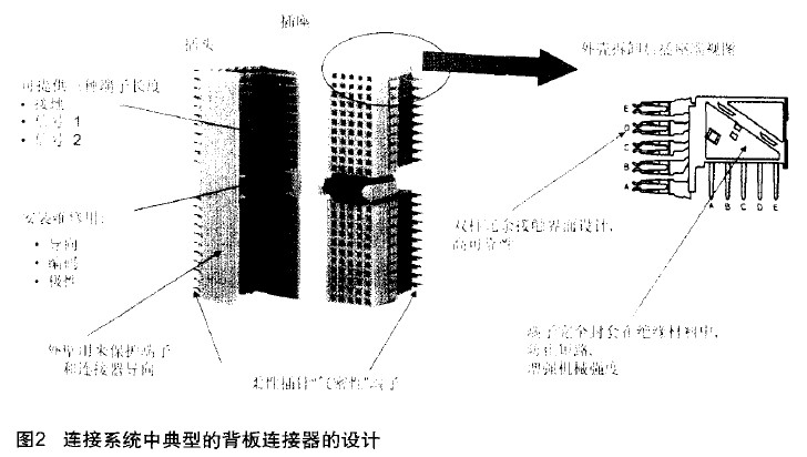 圖2是典型的連接系統(tǒng)中背板連接器的設(shè)計。它可以提供三種端子長度,即接地端子、信號1端子、信號2端子三個端子的長度是不同的。這是為了保證插座和插針在互相連接的時候,如果接反了,就無法插入。第二個是中問部分,它是用于安裝維修用的,整個插針板在插入的過程中,可以用來導向,甚至可以保證編碼和極性的正確。外壁用來保護端子和連接器的導向,這個端子就是插針部分,采用柔性插針。從右半部分圖中可以看到,外殼被拆除后,更清楚地顯示出了接觸面。它采用了雙柱冗余的接觸面設(shè)計,這樣可以大大提高接觸的可靠性。