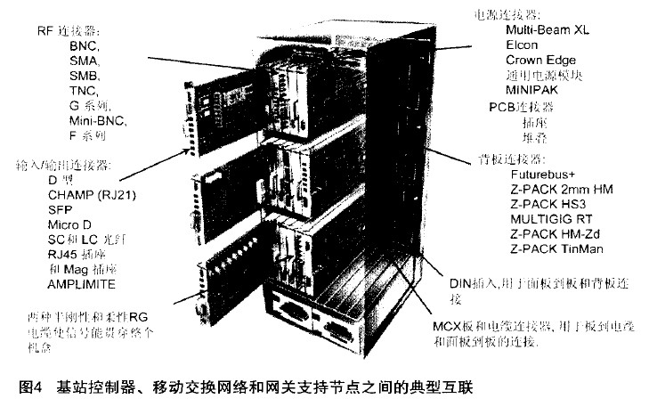 圖4表示的是基站控制器、移動交換網(wǎng)絡(luò)和網(wǎng)關(guān)支持節(jié)點之間的典型互聯(lián)。這些互聯(lián)也用到了多種連接器。