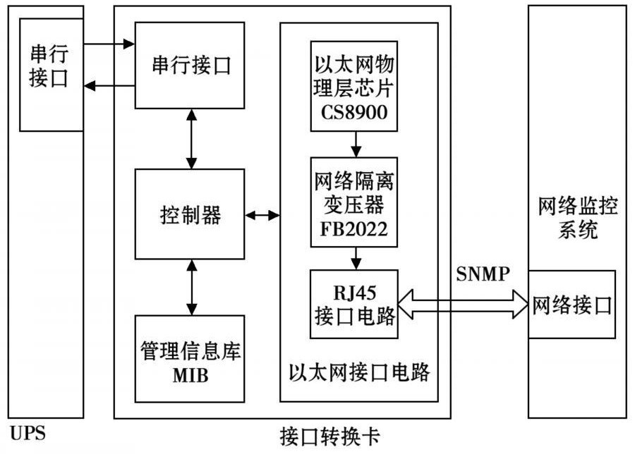 整個系統(tǒng)的核心為基于SNMP網(wǎng)絡(luò)管理協(xié)議的接口轉(zhuǎn)換卡。接口轉(zhuǎn)換卡一端通過網(wǎng)線與監(jiān)控計算機相連,管理人員通過計算機可方便地對其進行操作。接口轉(zhuǎn)換卡另一端通過與UPS上的串行接口連接,來獲取UPS工作的各種信息及參數(shù),然后再利用SNMP協(xié)議將接收到的數(shù)據(jù)轉(zhuǎn)換為管理信息庫(MIB)節(jié)點的變量值。管理員通過網(wǎng)絡(luò)管理軟件對MIB節(jié)點變量進行操作,從而獲得各UPS的監(jiān)控信息,實現(xiàn)了安全可靠的遠程分散式管理。