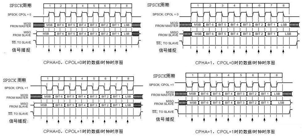 當CPHA=1、CPOL=1時SPI總線工作在方式4。與前者唯一不同之處只是在同步時鐘信號的上升沿時捕捉位信號,下降沿時下一位數(shù)據(jù)上線。