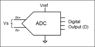 用于將傳感器信號(hào)數(shù)字化的ADC也是比例器件。無論其內(nèi)部架構(gòu)如何,所有ADC都是通過對(duì)未知輸入電壓與已知參考電壓相比較來工作的。轉(zhuǎn)換器的數(shù)字化輸出是輸入電壓與參考電壓的比值乘以ADC的滿量程讀數(shù)??紤]到內(nèi)部放大和設(shè)計(jì)的多樣性,還需要一個(gè)比例因子K。無論K值大小,只要ADC的配置未改變,K值都保持固定不變。公式4描述了一個(gè)普遍意義上的ADC (圖2)的數(shù)字讀數(shù)(D)和輸入信號(hào)(Vs),參考電壓(Vref),滿量程讀數(shù)(FS)以及比例因子(K)間的關(guān)系。