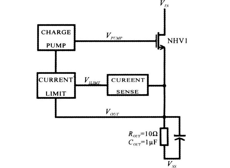 圖1為USB電源開關(guān)的整體設(shè)計。其中,VIN為電源輸入,VOUT為USB的輸出。在負載正常的情況下,由電荷泵產(chǎn)生足夠高的柵驅(qū)動電壓,使NHV1工作在深線性區(qū),以降低從輸入電源(VIN)到負載電壓(VOUT)的導(dǎo)通損耗。當(dāng)功率管電流高于1A時,Currentsense輸出高電平給過流保護電路(Currentlimit);過流保護電路通過反饋負載電壓給電荷泵,調(diào)節(jié)電荷泵輸出(VPUMP),從而使功率管的工作狀態(tài)由線性區(qū)變?yōu)轱柡蛥^(qū),限制功率管電流,達到保護功率管的目的。當(dāng)負載恢復(fù)正常后,Currentsense輸出低電平,電荷泵正常工作。
