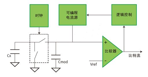 時鐘:本文提到的電容式感應系統(tǒng)是基于開關電容原理的。相反,物理上的傳感器電容通過在連續(xù)周期內給傳感器電容充放電模擬成了電阻。模擬電阻和傳感器電容值成正比,可以用電流源和一個數(shù)模轉換器來計算傳感器電容實際值。