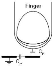 要感應到手指的存在,電容式感應系統(tǒng)首先要知道沒有手指時的傳感器電容(見圖2a),也稱為寄生電容(Cp)。當手指接近或接觸傳感器時(見圖2b),傳感器電容值將會變化,這就產生了和Cp并聯(lián)的另一個電容,稱為手指電容(Cf)。有手指存在時,總傳感器電容(Cx)如方程1所示: