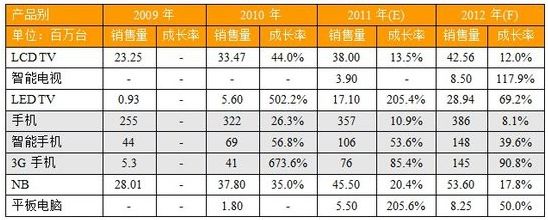 中國(guó)大陸LCD TV、手機(jī)和NB三大指針性消費(fèi)電子產(chǎn)品,拓墣預(yù)估2012年銷售量雖然分別成長(zhǎng)12%、8.1%和17.8%,但卻較2011年的13.5%、10.9%、20.4%成長(zhǎng)率遜色,更難與2010年的高成長(zhǎng)相提并論。顯示中國(guó)大陸內(nèi)需市場(chǎng)已漸趨飽和,超高成長(zhǎng)率很難再現(xiàn)。不過,中國(guó)大陸政府加速推展三網(wǎng)融合的策略,卻使得智能電視、智能手機(jī)、3G手機(jī)和平板電腦等利基產(chǎn)品,表現(xiàn)相對(duì)亮眼。