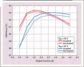 “表 1”所示規(guī)范為設(shè)計(jì)比較的基礎(chǔ)。第一個(gè)設(shè)計(jì)使用一個(gè)耦合電感,而第二個(gè)則使用兩個(gè)非耦合電感。