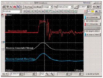 藍(lán)色波形是由白色波形濾波后減緩了脈沖上升沿得到的波形,它代表的就是對串?dāng)_進(jìn)行后濾波的結(jié)果。圖中顯示的紅色和藍(lán)色兩個(gè)串?dāng)_波形是以相同的電壓刻度顯示的。
