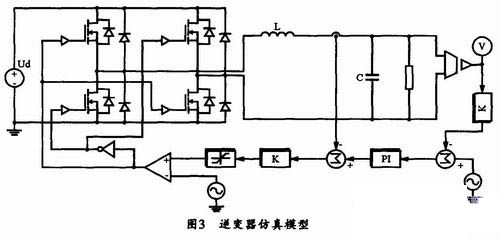 圖3所示是在PSIM下構(gòu)建的逆變器仿真模型。該模型主要有三部分:主電路、控制器和PWM脈沖生成模塊。其中控制器用于實現(xiàn)電壓電流雙環(huán)控制,為產(chǎn)生PWM脈沖提供調(diào)制信號;PWM脈沖生成模塊采用雙極性調(diào)制方式。根據(jù)整個系統(tǒng)的閉環(huán)特征方程,并綜合考慮系統(tǒng)的控制要求,再通過選取阻尼比和自然角頻率,就可以得到系統(tǒng)控制器的參數(shù)??紤]到單相全橋逆變器系統(tǒng)控制的性能要求,在此基礎(chǔ)上所確定的最終系統(tǒng)仿真參數(shù)如下:
