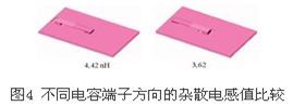 大功率器中分布雜散電感的抑制離不開緩沖電容和電解電容,出于成本考慮,一般選用鋁電解電容支撐母線直流電壓,由于其耐壓等級(jí)低,需要大量串并聯(lián),連接線路上的雜散電感會(huì)造成各并聯(lián)電容間高頻電流分布不均勻,距離功率器件較近的電容會(huì)承受高于額定值的電流而急劇發(fā)熱,因此這兩者是工業(yè)工程應(yīng)用中的主要問題。在電容結(jié)構(gòu)設(shè)計(jì)中,主要影響因素分別是:電容端子設(shè)計(jì)方向、電容串聯(lián)結(jié)構(gòu)設(shè)計(jì)。圖4分別測(cè)量了不同電容端子設(shè)計(jì)電感的值,圖5給出了典型設(shè)計(jì)方案和主流低電感設(shè)計(jì)方案中電容串聯(lián)方式的不同。從圖5中可以得出這樣的結(jié)論,電容端子的方向?qū)﹄姼杏休^大影響,而電容采用無環(huán)路串聯(lián)方式可以極大的降低母排電感。圖6給出了電容端子設(shè)計(jì)良好時(shí)母排電流的有限元分析,由圖6可以看出在母線排表面電流分布十分均勻,等效作用降低了電感。