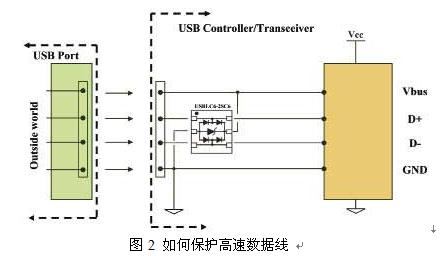這個辦法的實質(zhì)是在USB接口附近連接一個保護元器件。它由幾支采用軌對軌結構的二極管組成,本身具有低電容的特性。內(nèi)部鉗位器件為兩條數(shù)據(jù)線提供±25kV ESD (ISO10605)保護功能,以及為Vbus電源線提供保護功能。