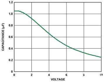 圖4所示為采用0402封裝的1 μF、10 V X5R電容與偏置電壓之間的關(guān)系。電容的封裝尺寸和電壓額定值對其電壓穩(wěn)定性影響極大。一般而言,封裝尺寸越大或電壓額定值越高,電壓穩(wěn)定性也就越好。X5R電介質(zhì)的溫度變化率在-40℃至+85°C溫度范圍內(nèi)為±15%,與封裝或電壓額定值沒有函數(shù)關(guān)系。