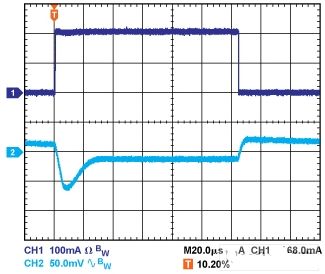 輸出電容還會影響調(diào)節(jié)器對負載電流變化的響應(yīng)??刂骗h(huán)路的大信號帶寬有限,因此輸出電容必須提供快速瞬變所需的大多數(shù)負載電流。當負載電流以500 mA/ μs的速率從1 mA變?yōu)?00 mA時,1 μF電容無法提供足夠的電流,因而產(chǎn)生大約80 mV的負載瞬態(tài),如圖1所示。當電容增加到10 μF時,負載瞬態(tài)會降至約70 mV,如圖2所示。當輸出電容再次增加并達到20 μF時,調(diào)節(jié)器控制環(huán)路可進行跟蹤,主動降低負載瞬態(tài),如圖3所示。這些示例都采用線性調(diào)節(jié)器ADP151,其輸入和輸出電壓分別為5 V和3.3 V。
