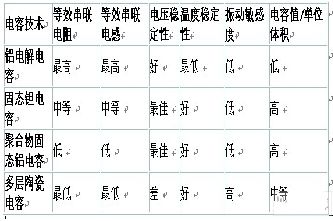 在電壓調(diào)節(jié)器中,以下三大類電容通常用作電壓輸入和輸出旁路電容:多層陶瓷電容、固態(tài)鉭電解電容和鋁電解電容下表對這三類電容進行了比較。