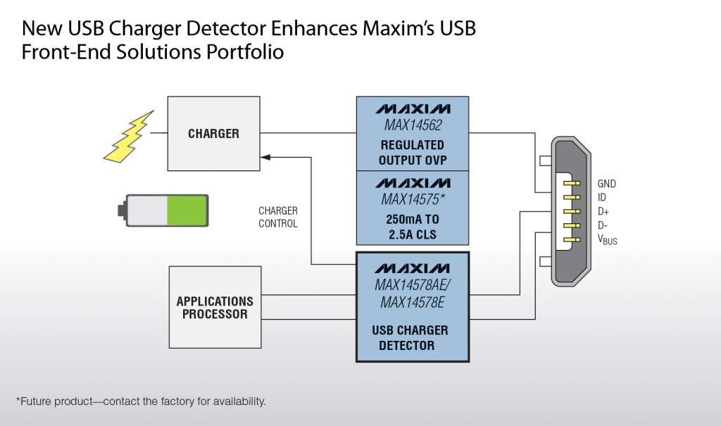 Maxim Integrated Products, Inc 于近日推出業(yè)內(nèi)尺寸最小、符合USB電池充電規(guī)范的USB電池充電檢測器MAX14578E/MAX14578AE。除了可以檢測Apple和Sony專有充電器適配器外,該系列器件還可以檢測USB標準下行端口(SDP)、USB充電下行端口(CDP)或?qū)S贸潆娖鞫丝?DCP)。一旦檢測到充電端口,MAX14578E/MAX14578AE將控制外部鋰離子(Li+)電池充電控制器,以優(yōu)化充電時間和充電效率。