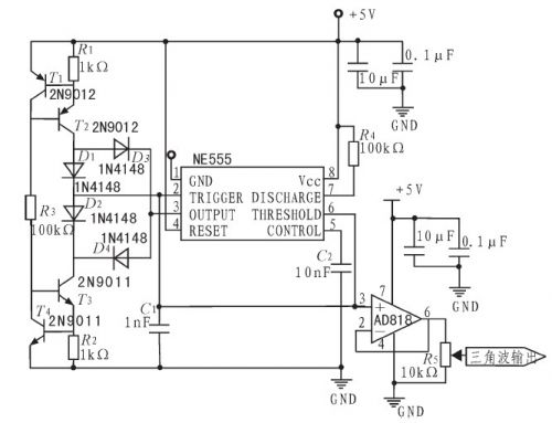 三角波產(chǎn)生電路如圖2所示。采用NE555芯片構(gòu)成三角波電路,通過(guò)恒流源對(duì)電容C1實(shí)現(xiàn)線性充放電從而獲得三角波。開(kāi)始工作時(shí),555芯片3號(hào)腳為高電平,二極管D4導(dǎo)通,D3截止,從而D1導(dǎo)通,D2截止,由T1、T2、R1構(gòu)成的恒流源通過(guò)D1對(duì)C1線性充電,當(dāng)充電使C1兩端電壓達(dá)到2/3Vcc時(shí),3號(hào)腳輸出電平發(fā)生反轉(zhuǎn),變?yōu)榈碗娖?,此時(shí)D1、D2、D3、D4導(dǎo)通狀態(tài)也完全相反,由下方T3、T4、R2構(gòu)成的恒流源通過(guò)D2對(duì)C1線性放電,當(dāng)放電使C1兩端電壓達(dá)1/3Vcc時(shí),3號(hào)腳又反轉(zhuǎn)為高電平,如此循環(huán)往復(fù),實(shí)現(xiàn)周期三角波信號(hào)產(chǎn)生。由C1兩端引出輸出,即可得到線性度良好的三角波信號(hào),后接一級(jí)同相跟隨器已達(dá)到前后級(jí)隔離的目的。C1采用漏電流低、響應(yīng)速度快的聚苯乙烯電容,保證較好性能。